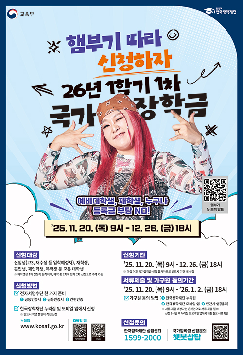 1. (학생신청기간) 2025. 11. 20.(목) 9시 ~ 2025. 12. 26.(금) 18시까지 ※ 주말 및 공휴일 포함 신청기간 내 24시간 신청가능(단, 마감일 제외)2. (서류제출 ..