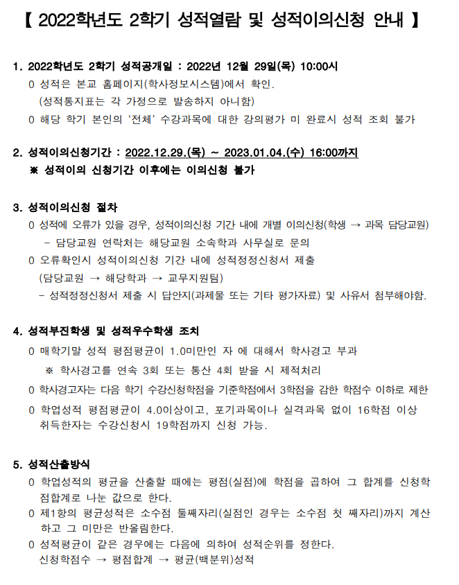2. 성적이의신청기간 : 2022.12.29.(목) ~ 2023.01.04.(수) 16:00까지
