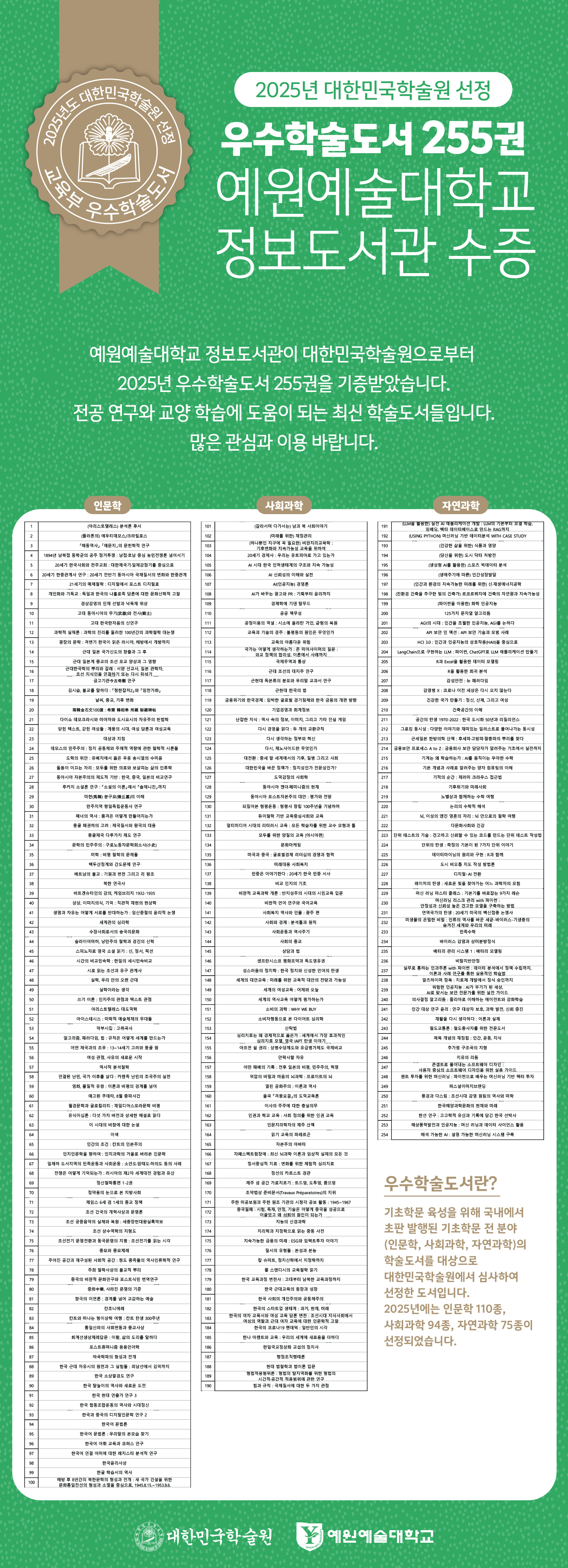 2025년 대한민국학술원 선정 우수학술도서 255권 예원예술대학교 정보도서관 수증 일반공지