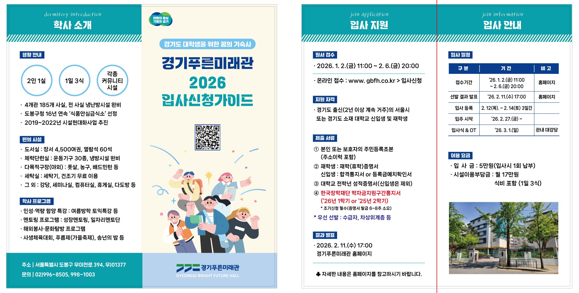 경기 지역 출신 대학생의 주거 부담 경감 및 안정된 대학생활을 지원하는 경기푸른미래관에서‘2026년 입사생 선발’ 지원자를 모집합니다.