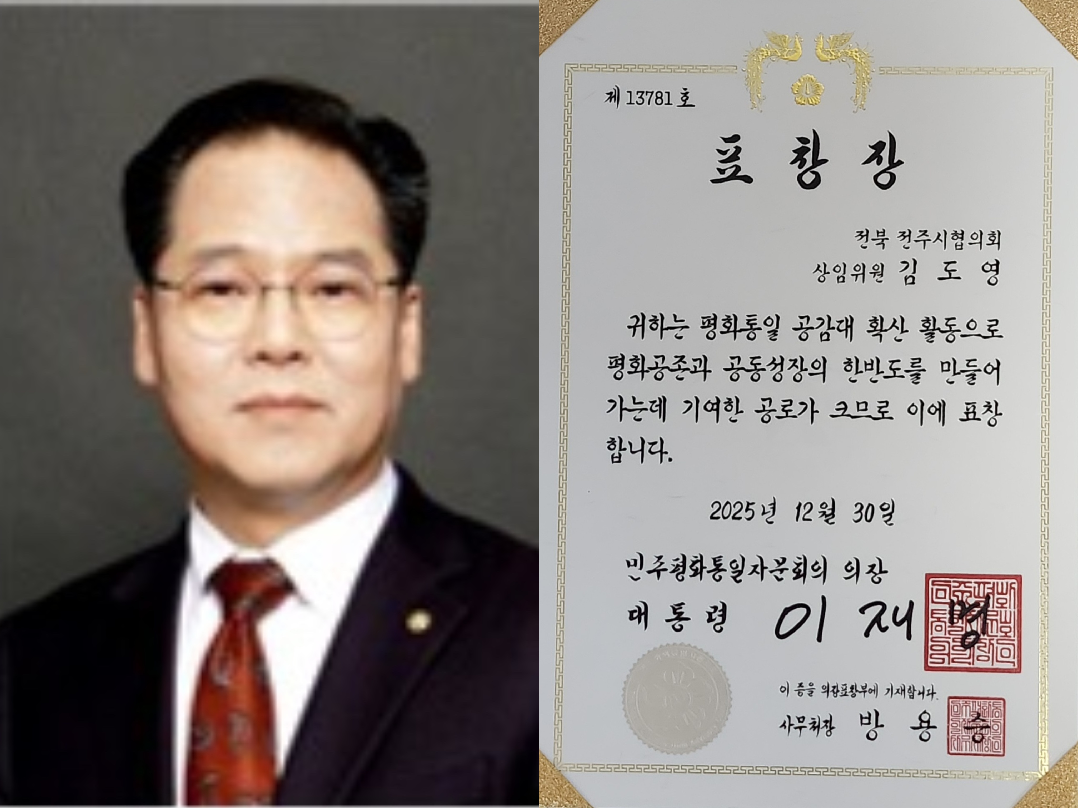 남과 북의 전통문화 교류에 관한 실질적 정책자문을 건의한 공로를 인정받아 의장상인 대통령 표창장을 수여받았다.