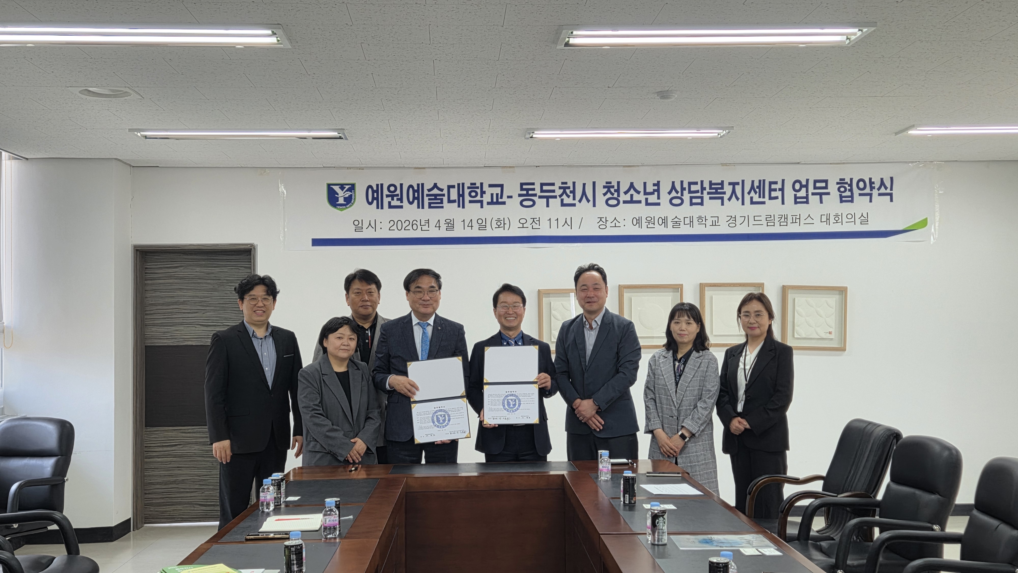 예원예술대학교(총장 고광모)는 2026년 4월 14일(화) 오전 11시, 동두천청소년상담복지센터(법인 대표 유지룡)와 청소년 정서 안정 및 위기 예방을 위한 업무협약(MOU)을 체결했다. 협약식에는 고광모 총장, 소현정 입학처장, 김재명 학생상담센터장 외 2명과 동두천청소년상담복지센터 법인 대표 유지룡, 황상연 센터장 외 3명이 참석해 상호 협력을 다짐했다.