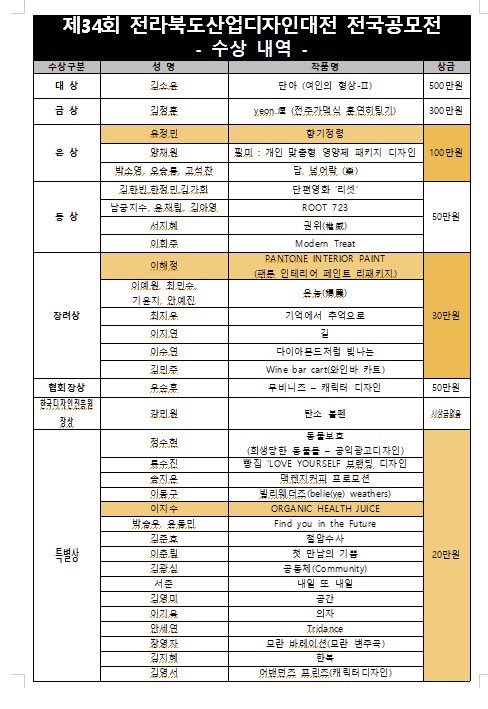 전라북도 산업디자인 전국 공모전에서 예원예술대학교 시각디자인학과 재학생들이 입상을 하였습니다.