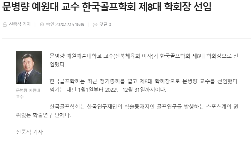 문병량 예원예술대학교 교수가 한국골프학회 제8대 학회장으로 선임됐다.