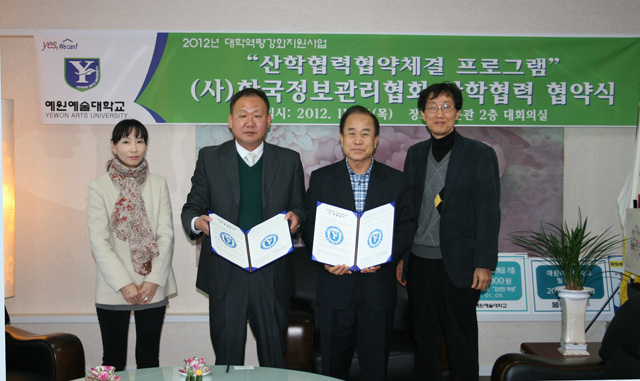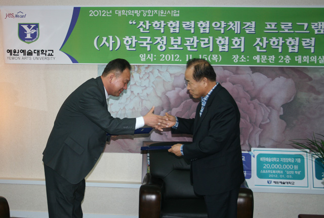 예원예술대학교와 한국정보관리협회는 다변화되고 있는 지식정보화 시대에 양 기업 간 전략적 제휴를 통해서 정보의 공유와 발전방안을 구축해 나가기로 하고 이의 실천을 위하여 산학협력체결을 하였습니다.