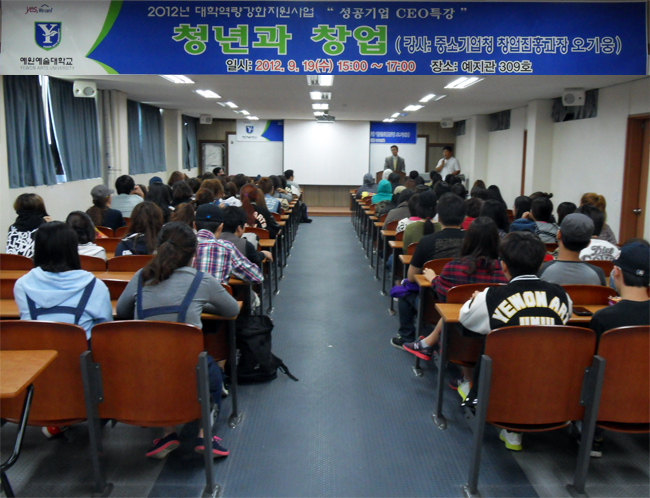 2012 교육역량강화사업 CEO 특강을 9월 19일(예지관 309) 중소기업청 창업진흥과장인 오기호과장님의 “청년과 창업”이라는 주제로 특강을 실시하였습니다.