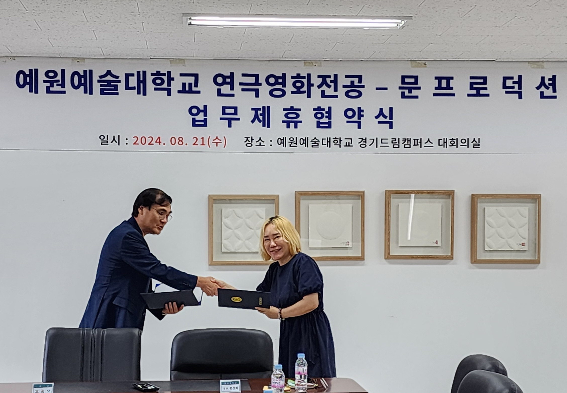 예원예술대학교(총장 고광모) 연극영화전공과 문프로덕션(대표 문선희)은 우수한 예술 인재 양성을 위하여 상호 업무협약을 체결하였습니다.