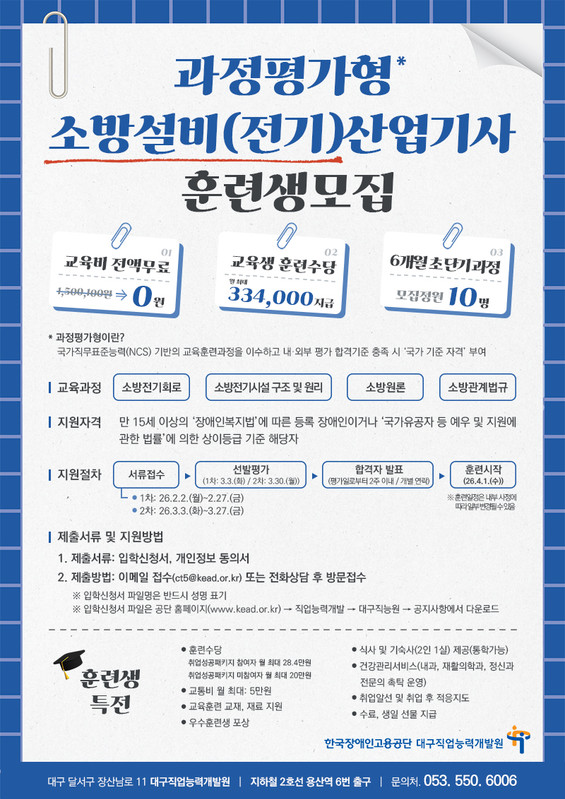 과정평가형 소방설비(전기)산업기사 취득과정 훈련생 모집