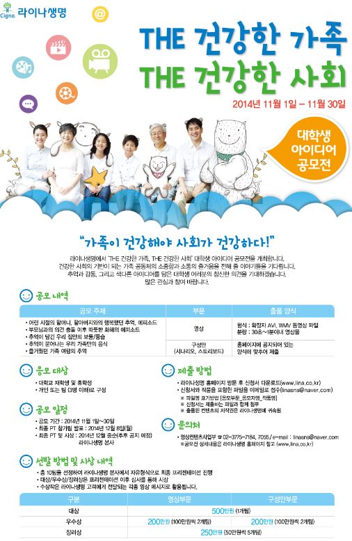라이나생명에서 ‘THE 건강한 가족, THE 건강한 사회’ 대학생 아이디어 공모전을 개최합니다.