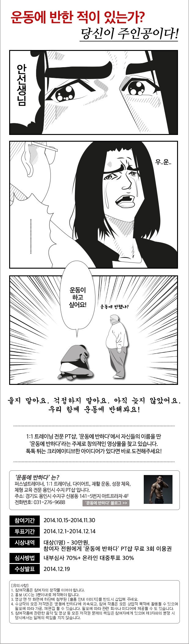 - 1:1 트레이닝 전문 PT샵, '운동에 반하다'에서 '운동에 반하다'라는 주제로 창의적인 영상물을 찾습니다!